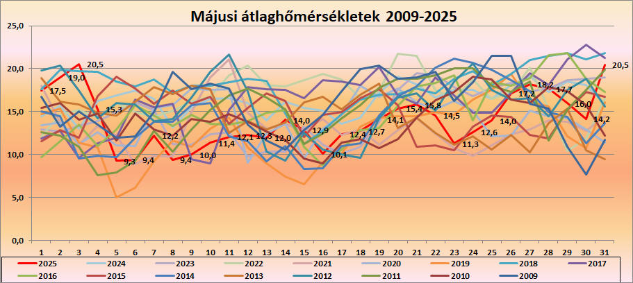 Legmagasabb hőmérséklet 29,90°C, ami május 3-án volt, a legalacsonyabb hőmérséklet